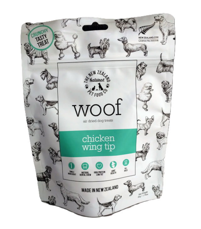 ※賞味期限:25.6 【WOOF】商品説明 woof チキンウィングティップは、免疫力維持、疲労回復、目の健康維持、骨や歯の健康維持に役立つ、 上質なたん白質、脂質、カルシウムやビタミンA、B群を多く含んでいます。 鶏皮もそのまま加工しているので、皮膚・被毛や関節の健康を維持するコラーゲンがたっぷり含まれています。 素材の風味や栄養を損ないにくい、エアドライ製法でゆっくり時間をかけて作っています。 内容量:50g 原産国:ニュージーランド 原材料:チキンウィングティップ 保証成分 たん白質37%以上、脂質40%以上、粗繊維2%以下、水分8%以下、代謝カロリー513.0kcal/100g