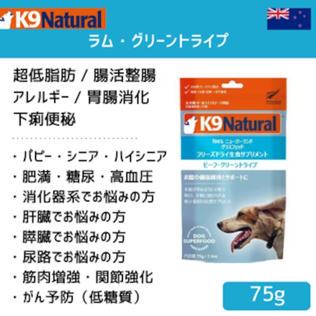 K9ナチュラル ラム・グリーントライプ 【腸活】【整腸】【超低脂肪】 こんな方にオススメ: 超低脂肪 全てはココカラ始まる。 腸活・整腸で変わるのは便だけではないです。 消化吸収力が上がることによって賢者タイム突入します。 ①パピー・シニア・ハイシニア ②マッスル体型(運動量と給与量で調整) ②入院・術後・回復期(高消化・少量・高栄養) ③肥満・糖尿・高血圧(低糖質・低炭水化物) ④消化器系でお悩みの方(低炭水化物・高消化) ⑤肝臓でお悩みの方(メチオニン、高消化良質) ⑥膵臓でお悩みの方(低糖質・高消化の良脂質) ⑦尿路でお悩みの方(老廃物少ない・適正PH) ⑧筋肉増強・関節強化したい方 ⑨がん予防(低糖質) K9シリーズ特徴 ・世界の中でもトップクラスの最高品質 ・少量で高栄養 ・超高消化 ・炭水化物・糖質フリー ・芋・豆・穀物不使用 ・よって本物のグレインフリー ・ツナギ不使用の為、ドライフードではない ・90%以上肉の缶詰の水分を瞬間冷凍乾燥 ・加熱処理してないため酵素が残ってる ・K9の消化温度は目安38度(通常ドライは100度) ・摂取した直後に消化吸収するため消化負担が低い ・お水に戻せばウェットフードになる ・保存期間が長いため防災避難用でも使える ・ウェットの良い所とドライの保存性 原材料 子羊のグリーントライプ(胃袋)100% 栄養情報 粗たん白質 60.0%以上 粗脂肪 18.0%以上 粗繊維 2.4%以下 水分 8.0%以下 100g中のカロリー 416.5kcal 給与量の目安 フード1食分に対し 小型犬の場合、2~3粒程度。 中型犬の場合、3~7粒程度。 大型犬の場合、7~15粒程度。 個体差がありますので、様子を見ながら、調整してください。