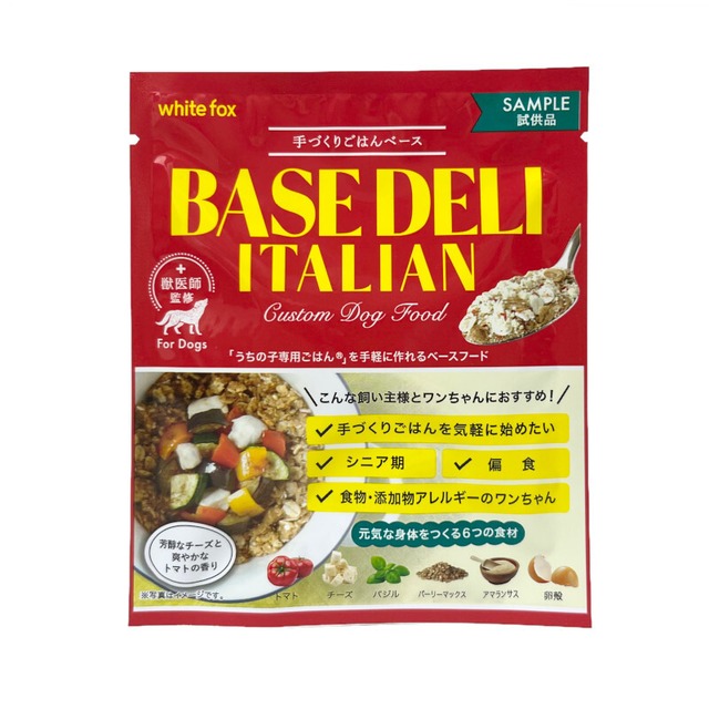 【この商品の特徴】 「うちの子専用ごはん?」を手軽に作れるベースフード ベースデリイタリアンは元気な身体を作るための食材(トマト・チーズ・バジル・バーリーマックス・アマランサス・卵殻)を使用し、芳醇なチーズと爽やかなトマトの香りが特徴です。 ワンちゃんの好みや体質に合わせたお肉やお魚などをトッピングすれば手軽に「うちの子専用ごはん?」が作れます。 【原材料】 大麦フレーク、さつまいも、オートミール、バーリーマックス、トマト、チーズ、にんじん、キャベツ、れんこん、卵殻、アマランサス、大麦若葉、りんごセラミド、ヤーコン、バジル、ケール、ほうれん草、かぼちゃ 【成分】 粗たんぱく質:8.3%以上、粗脂肪:4.1%以上、粗繊維:1.7%以、下粗灰分:3.0%以下、水分:8.4%以下、リン:0.16%、マグネシウム:0.06%、ナトリウム:0.10% 【カロリー】 325kcal/100g 【その他】 【ベースデリイタリアンを使ったうちの子専用ごはんの作り方】 ①ベースデリイタリアンをお皿に入れます。 ②40~60℃くらいのお湯をかけ、ムラなく混ぜ合わせます。 ③好みや体質に合ったお肉やお魚をトッピングして出来上がりです。 【お肉・お魚のトッピング例】 肥満が気になる:鶏ササミ、鶏むね肉、鱈など 関節ケア:サケ、サバ、マグロなど 皮膚被毛ケア:牛レバー、豚レバーなど 【ドッグフードのトッピングとして】 食いつきを良くするために、いつものドッグフードへのトッピングとしてもお使い頂けます。 食べムラがある、食欲がないワンちゃんやシニア犬にもオススメです。 【給与の目安量】(1日2食与える場合の1食分) 体重1~3kg:ベースデリイタリアン/大さじ1~2(7~14g)、お湯/ベースデリイタリアンと同量~2倍、肉・魚などのたんぱく源/12~24g、ホワイトフォックスのフリーズドライ/3~6g 体重3~5kg:ベースデリイタリアン/大さじ2~3(14~21g)、お湯/ベースデリイタリアンと同量~2倍、肉・魚などのたんぱく源/24~36g、ホワイトフォックスのフリーズドライ/6~9g 体重5~10kg:ベースデリイタリアン/大さじ3~7(21~50g)、お湯/ベースデリイタリアンと同量~2倍、肉・魚などのたんぱく源/36~85g、ホワイトフォックスのフリーズドライ/9~20g 体重10~20kg:ベースデリイタリアン/大さじ7~12(50~85g)、お湯/ベースデリイタリアンと同量~2倍、肉・魚などのたんぱく源/85~145g、ホワイトフォックスのフリーズドライ/20~35g