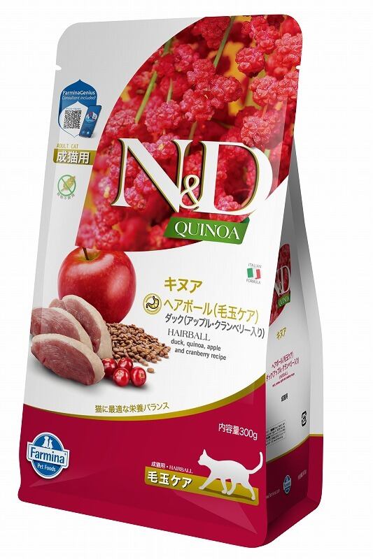 〈即日〉【猫・N&D】 キヌア ヘアボール(毛玉ケア)ダック(アップル・クランベリー入り)成猫用 300g