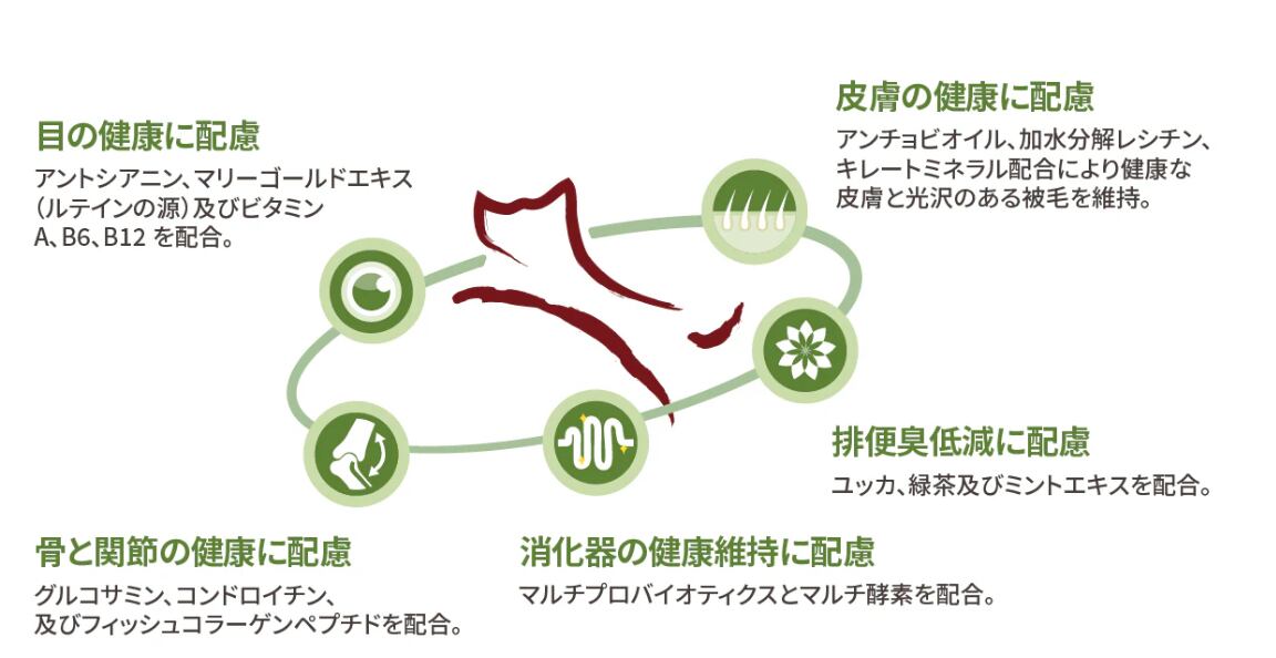 有機酸(乳酸、クエン酸)、加水分解レシチン、タウリン、複合消化酵素(プロテアーゼ、アミラーゼ、セルラーゼ、βグルカナーゼ)、複合プロバイオティクス(乳酸菌、乳酸菌LP28、枯草菌、ビフィズス菌ロンガム種)、βグルカン、ミネラル類(有機亜鉛、有機クロム、鉄、マンガン、銅、亜鉛、セレン、コバルト)、セピオライト、コラーゲンペプチド(魚皮由来)、ユッカシジゲラ抽出物、グルコサミン、コンドロイチン、マリーゴールド抽出物(ルテインの源)、酸化防止剤(緑茶、ミント、ローズマリーエキス)、ビタミン類(A、B1、B2、パントテン酸、B6、葉酸、B12、被覆アスコルビン酸、D3、天然ビタミンE、コリン)、L-カルニチン