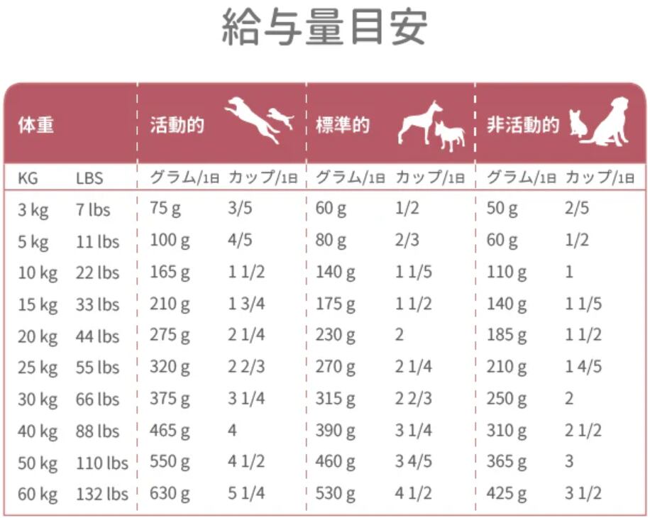 新鮮な肉(ダック)、新鮮な魚貝(サーモン、ホタテ)、精製台湾蓬莱米、動物性脂肪(アンチョビ油、鶏油、混合トコフェロールで酸化防止)、亜麻仁、加水分解鶏肉ペプチド、オーツ麦、ビート、台湾フリーズドライ野菜(人参、南瓜、キャベツ、ほうれん草)、台湾フリーズドライ果実(りんご)、アルファルファ、エクストラバージンオリーブオイル