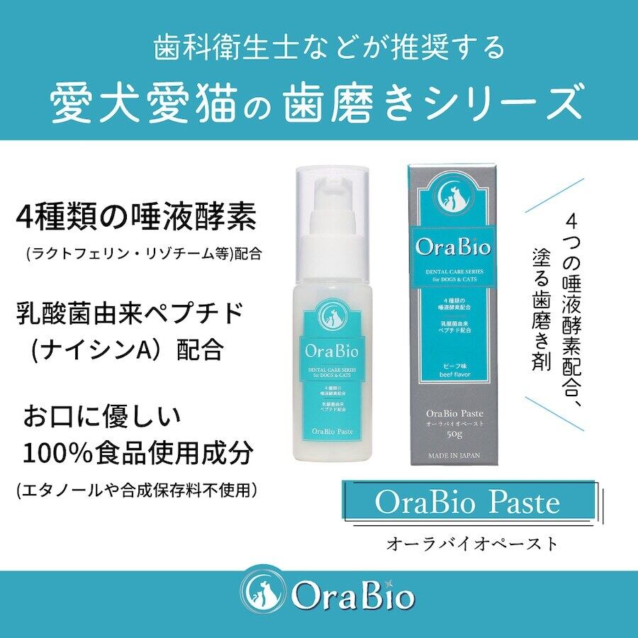 犬猫用歯磨き剤「オーラバイオペースト」は、ラクトフェリンやリゾチームなど4種の唾液酵素を配合し、清掃剤には卵殻由来のアパタイトを配合しました。乳酸球菌培養エキス(ナイシンA)も配合した合成保存料などを使わない、ペットのお口に優しい歯磨き剤です。