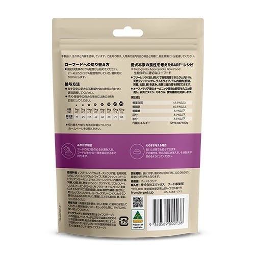 「草食動物を丸ごと食べていた野生のオオカミの食事が犬にとっても理想の食事である」愛犬本来の食性を考えたBARFレシピ(生物学的に適切なローフード)に基づき、開発されました。消化酵素やビタミン、ミネラル、必須脂肪酸(オメガ3脂肪酸/オメガ6脂肪酸)やプロバイオティクス(善玉菌)など、生肉や内臓にもともと含まれている栄養素が加熱加工処理によって失われないように加熱せずに加工を最小限に抑えたフリーズドライ製法を採用。オーストラリアの恵まれた自然の中で育ったラムと天然魚、オーガニック野菜、フルーツなど安心安全な原材料を厳選し、生のままだからこそ得られる豊富な栄養とおいしさを実現しました。ドライフードに比べて長期間の保存が可能で軽くて持ち運びが便利なため、非常時の保存食としてもご活用いただけます。