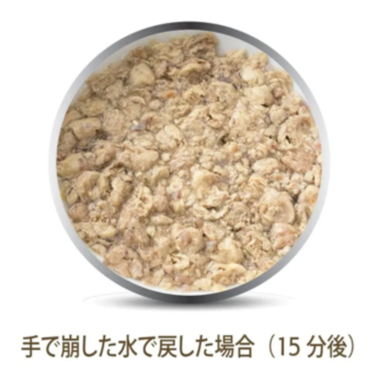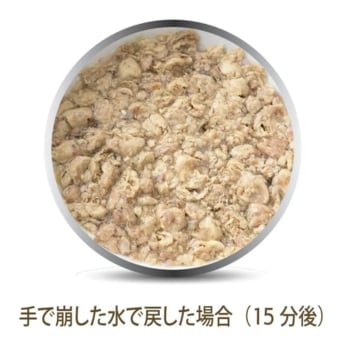 K9ナチュラルは、原材料の99%以上に自然食材を使用し、その栄養や風味を最大限に生かすため、原材料の加工・加熱を最小限に抑えた特殊なフリーズドライ製法を採用しています。そのため、原材料の収穫時期やサプライヤー(供給元)の違い、季節による家畜・家禽の脂肪分の違い、気候による野菜・果物などの成分の違いなど、素材の特長がそのまま、粒に反映されるため、保証成分値の範囲内ではありますが、粒の形状や、硬さ、色や香りなど、違いがあります。また、一般的なドライフードのように、肉食動物である犬にとって不要な、穀類・イモ類・豆類などの、粘性の高いツナギや量増しとしての原材料を一切使用していないため、1粒1粒が柔らかく、簡単に、ほぐせるようになっています。 K9ナチュラルは、基本的な与え方として、本来の食事に近づけるために、生食の水分値に戻してから与えていただくフードですので、粉状になっているものはそのまま、粒状のものはくずしてから、水かぬるま湯(37℃以下)を加えると、短い時間で、戻ります。