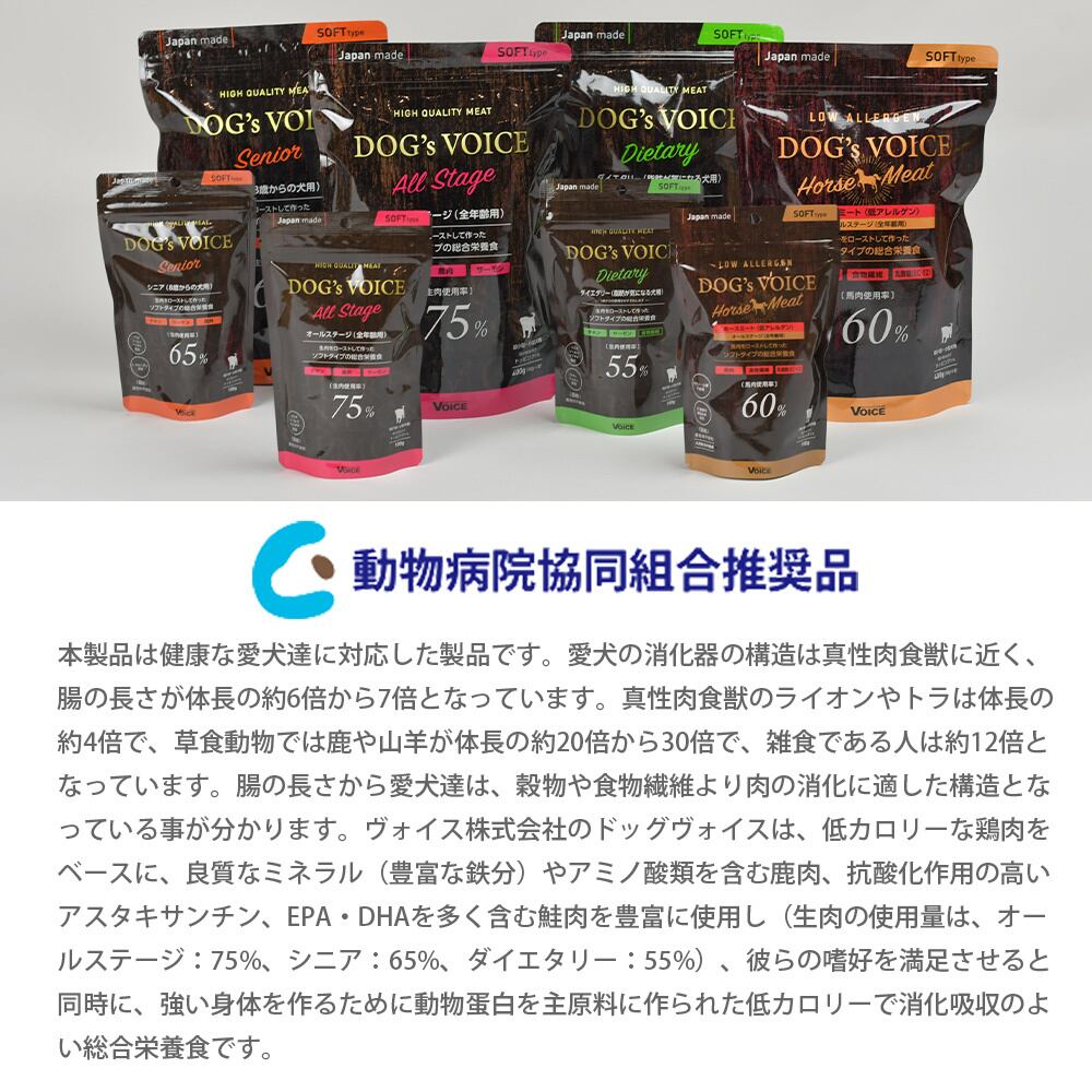 ヴォイス株式会社のドッグヴォイスは、低カロリーな鶏肉をベースに、良質なミネラル(豊富な鉄分)やアミノ酸類を含む鹿肉、抗酸化作用の高いアスタキサンチン、EPA・DHAを多く含む鮭肉を豊富に使用し(生肉の使用量は、オールステージ:75%、シニア:65%、ダイエタリー:55%)、彼らの嗜好を満足させると同時に、強い身体を作るために動物蛋白を主原料に作られた低カロリーで消化吸収のよい総合栄養食です。