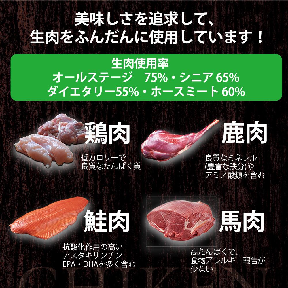 だからこそ本製品は鶏肉、鹿肉、鮭の生肉をより多く使用しています。