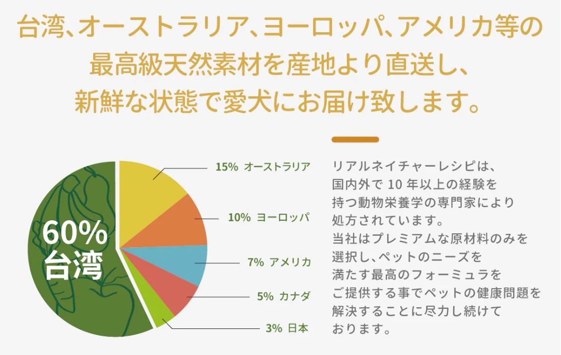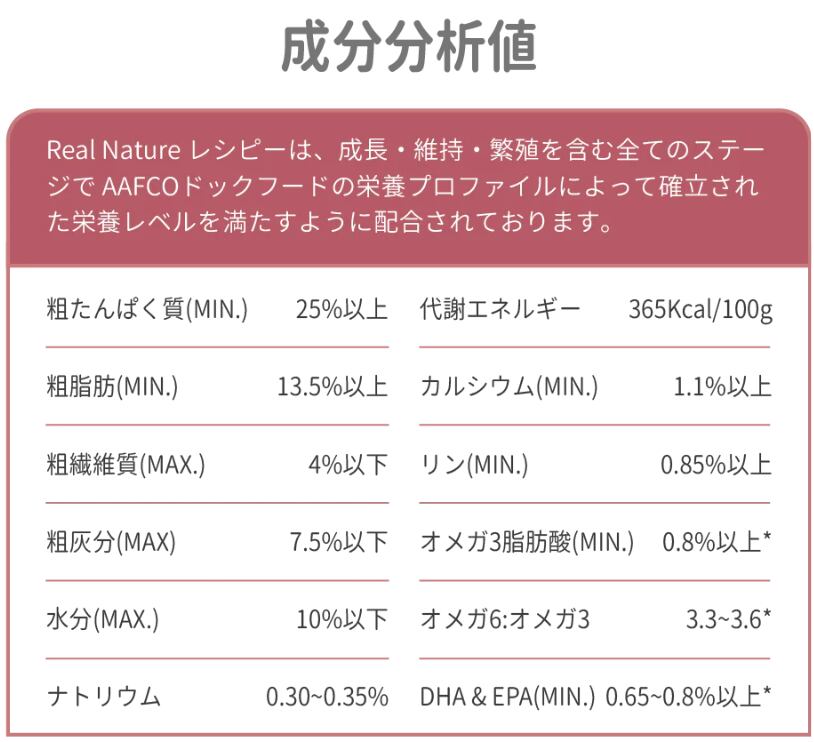新鮮な肉(ダック)、新鮮な魚貝(サーモン、ホタテ)、精製台湾蓬莱米、動物性脂肪(アンチョビ油、鶏油、混合トコフェロールで酸化防止)、亜麻仁、加水分解鶏肉ペプチド、オーツ麦、ビート、台湾フリーズドライ野菜(人参、南瓜、キャベツ、ほうれん草)、台湾フリーズドライ果実(りんご)、アルファルファ、エクストラバージンオリーブオイル