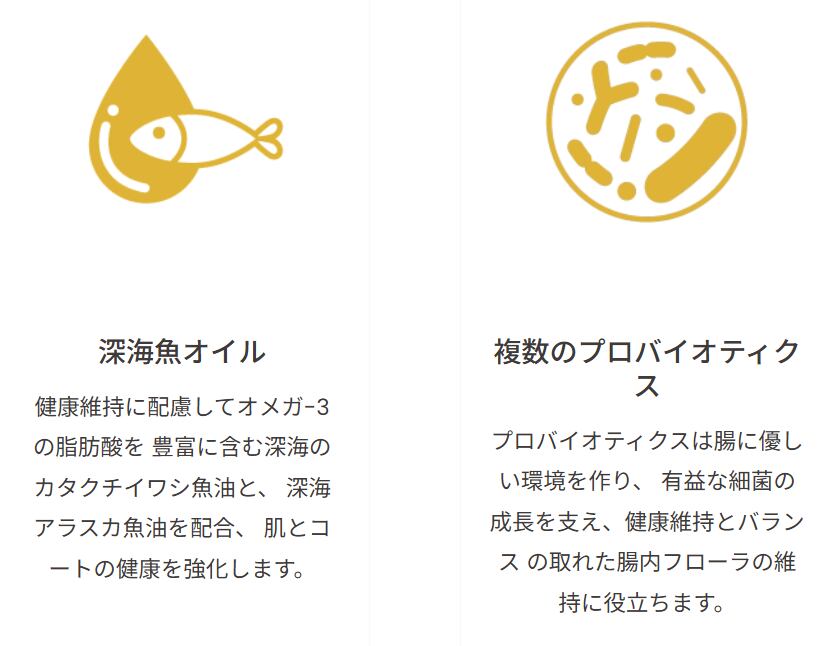 健康維持に配慮してオメガ-3の脂肪酸を 豊富に含む深海のカタクチイワシ魚油と、 深海アラスカ魚油を配合、 肌とコートの健康を強化します。