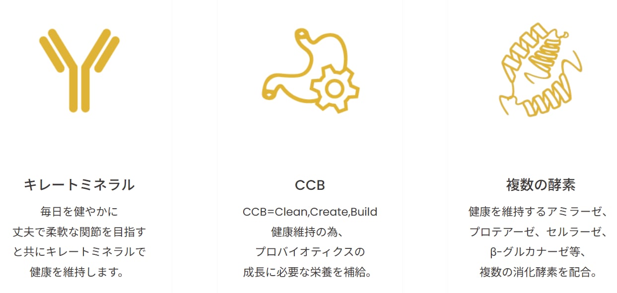 有機酸(乳酸、クエン酸)、ミネラル類(鉄、マンガン、銅、亜鉛、セレン、コバルト、有機亜鉛、有機クロム)、コラーゲンペプチド(魚皮由来)、セピオライト、マリーゴールド抽出物(ルテインの源)、加水分解レシチン、複合消化酵素(プロテアーゼ、アミラーゼ、セルラーゼ、βグルカナーゼ)、複合プロバイオティクス(乳酸菌、ビフィズス菌ロンガム種、枯草菌)、βグルカン、ユッカシジゲラ抽出物、DL-メチオニン、トリプトファン、グルコサミン、コンドロイチン、タウリン、酸化防止剤(緑茶、ミント、ローズマリーエキス)、L-カルニチン、ビタミン類(A、B1、B2、葉酸、パントテン酸、B6、B12、被覆アスコルビン酸、D3、天然ビタミンE、コリン)