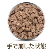 また、一般的なドライフードのように、肉食動物である猫にとって不要な穀類・イモ類・豆類などの粘性の高いツナギや、量増しとしての原材料を一切使用していないため、1粒1粒が柔らかく簡単にほぐせるようになっています。