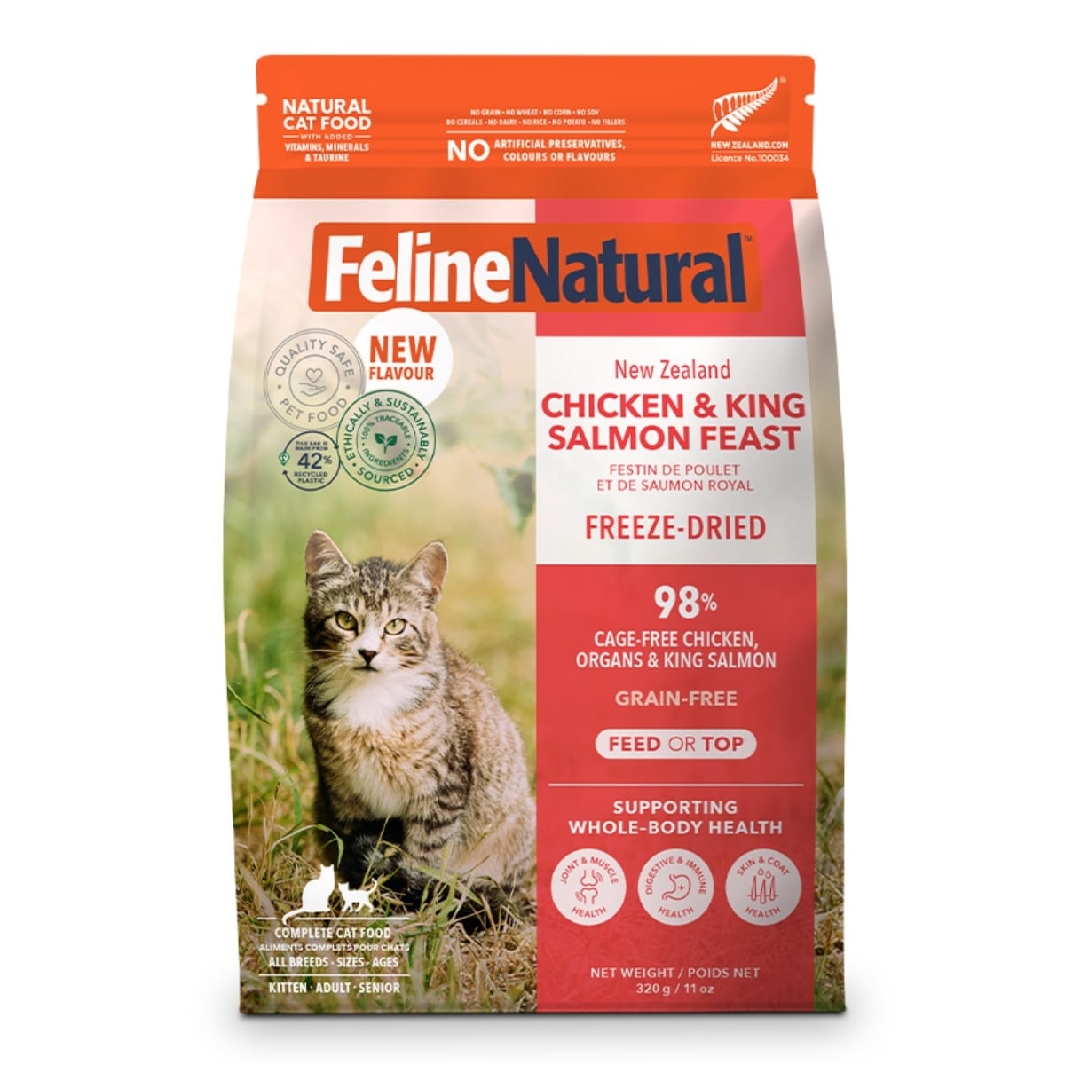 鶏肉、肝臓(鶏)、鮭、ニュージーランド緑イ貝、ビタミンE、ホキ(白身魚)オイル、乾燥昆布、タウリン、フラックスシードフレーク、塩化コリン、リン酸二カリウム、塩化ナトリウム、ミネラル類(酸化マグネシウム、プロティネイト亜鉛、プロティネイト銅、プロティネイトマンガン)、ビタミン類(ビタミンB1、ビタミンB6、葉酸、ビタミンD3)
