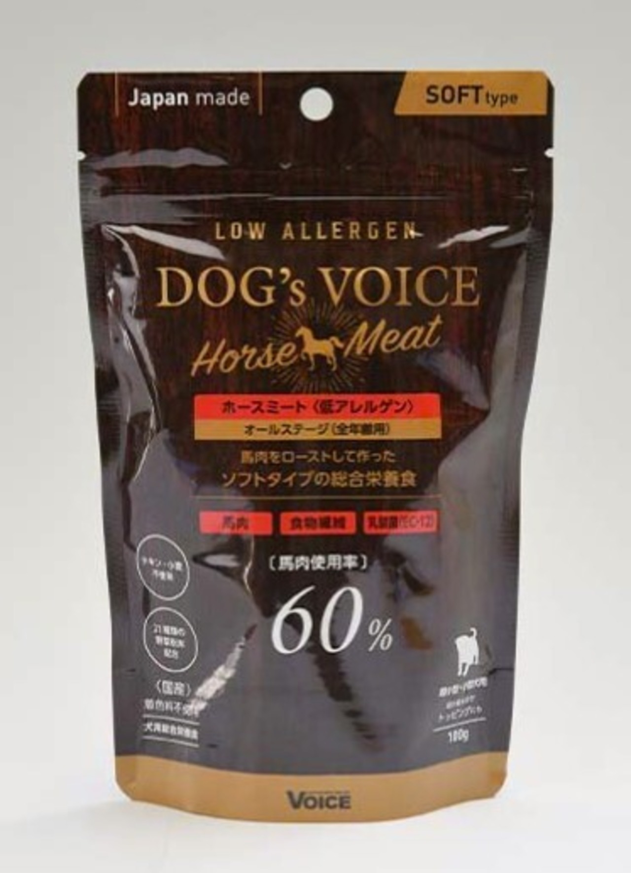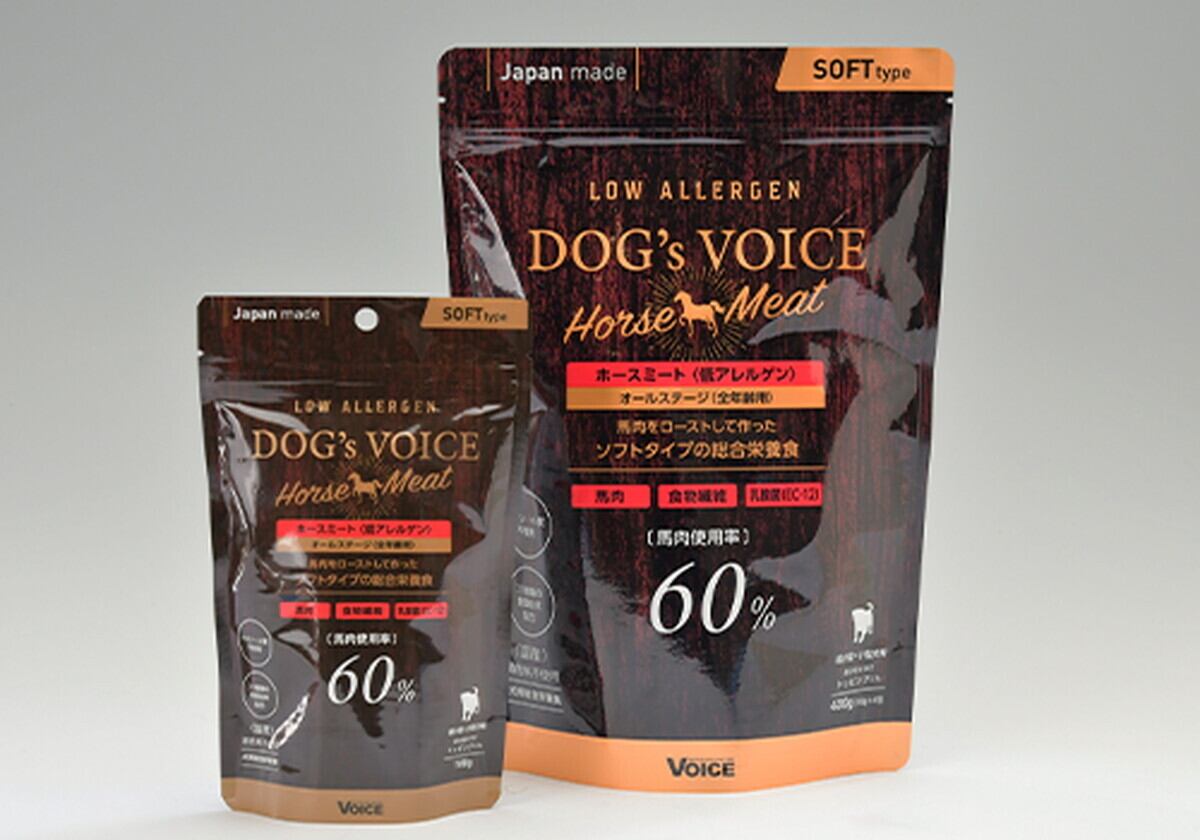 ヴォイス株式会社のドッグヴォイスは、低カロリーな鶏肉をベースに、良質なミネラル(豊富な鉄分)やアミノ酸類を含む鹿肉、抗酸化作用の高いアスタキサンチン、EPA・DHAを多く含む鮭肉を豊富に使用し(生肉の使用量は、オールステージ:75%、シニア:65%、ダイエタリー:55%)、彼らの嗜好を満足させると同時に、強い身体を作るために動物蛋白を主原料に作られた低カロリーで消化吸収のよい総合栄養食です。