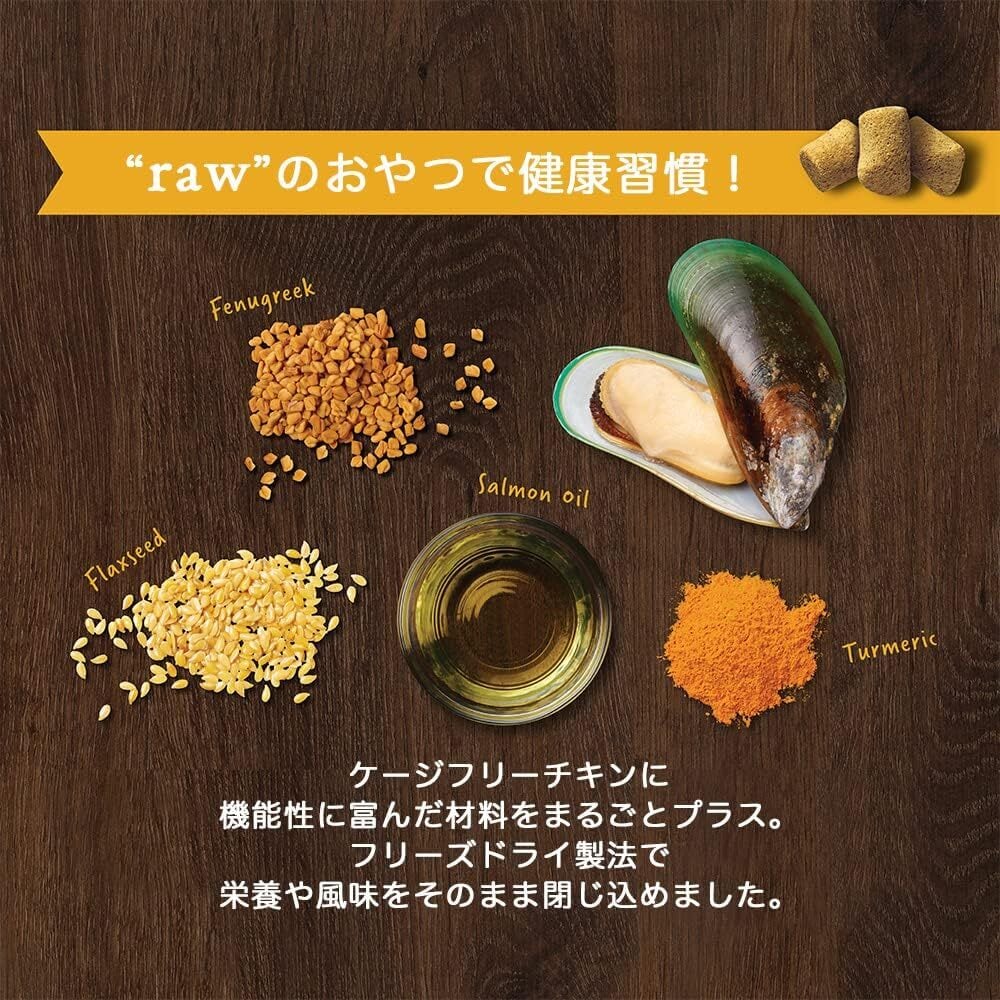 ● ケージフリー ( 放し飼い ) チキン、亜麻仁、グリーンマッセル(ニュージーランド産)、ターメリック、フェヌグリーク由来のグルコサミンとコンドロイチンで関節の健康維持。