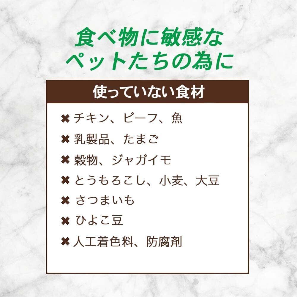 ● グレインフリー(トウモロコシ、大豆不使用)、グルテンフリー(小麦、大麦、ライ麦不使用)、GMOフリー(遺伝子組み換え作物不使用)、合成保存料、人工着色料不使用。