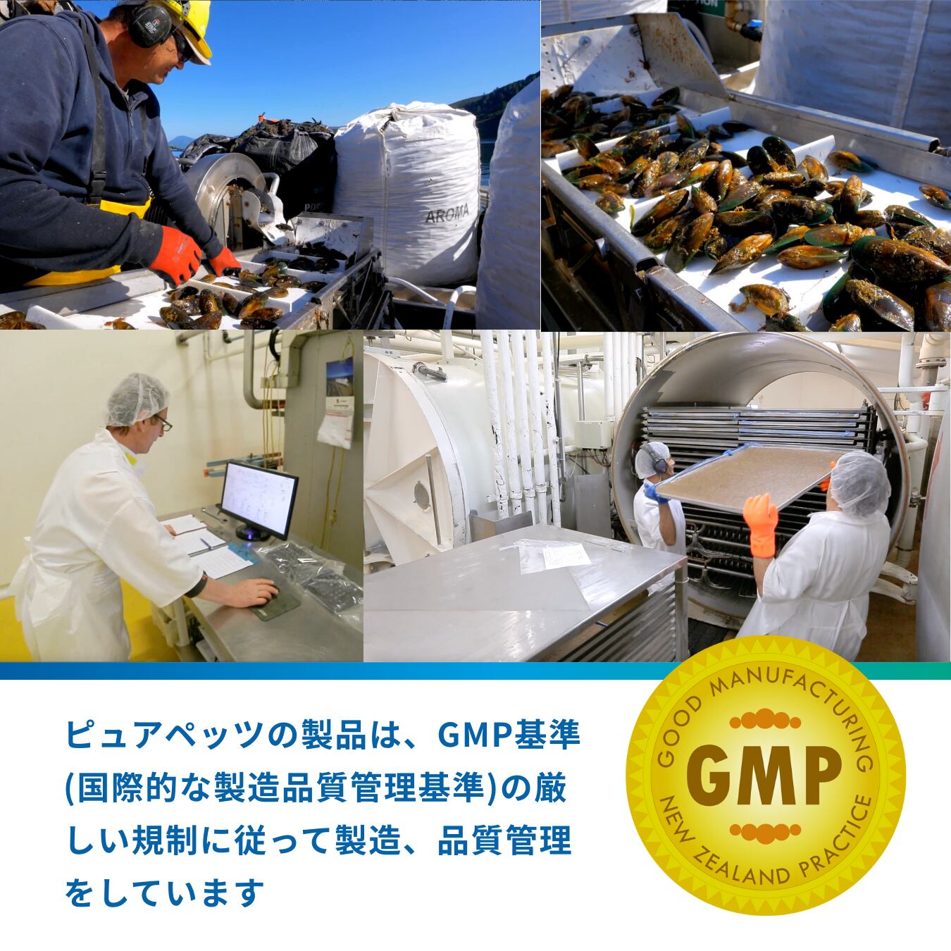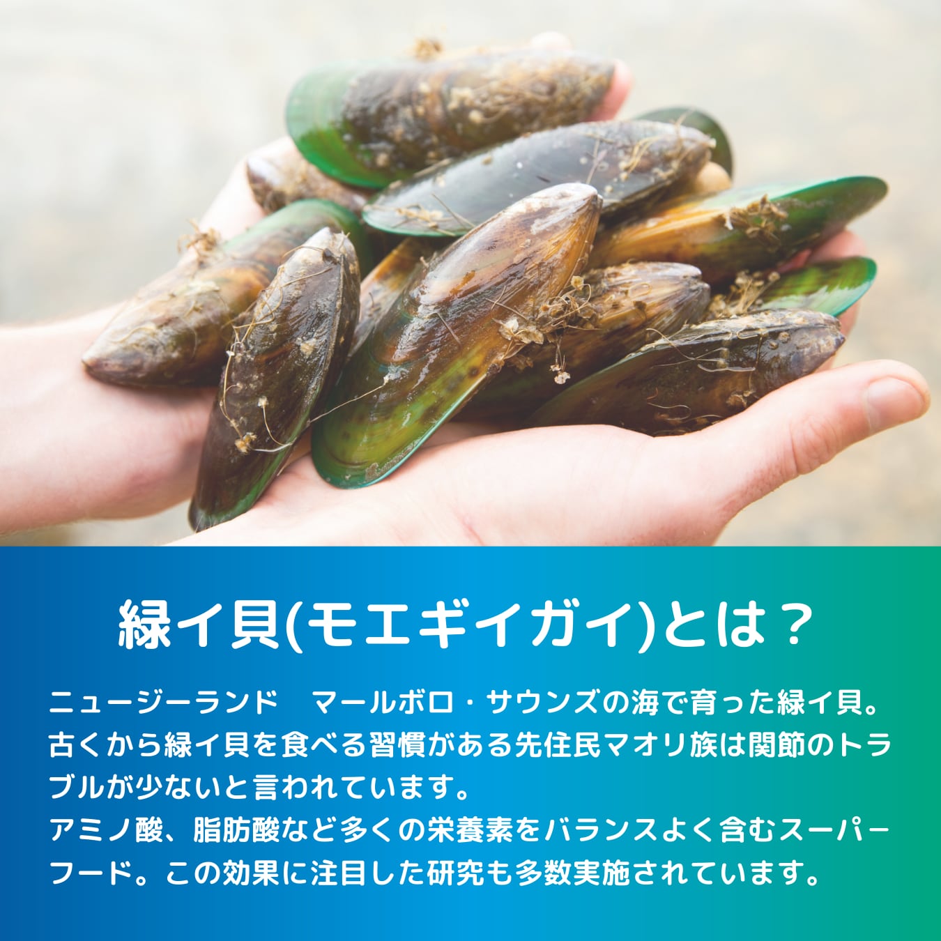 【緑イ貝について】ニュージーランド固有の貝で、殻の縁が鮮やかな緑色をしていることからその名が付けられました。関節の健康維持について多くの研究結果があり、自然由来のスーパ-フードとしてよく知られています。
