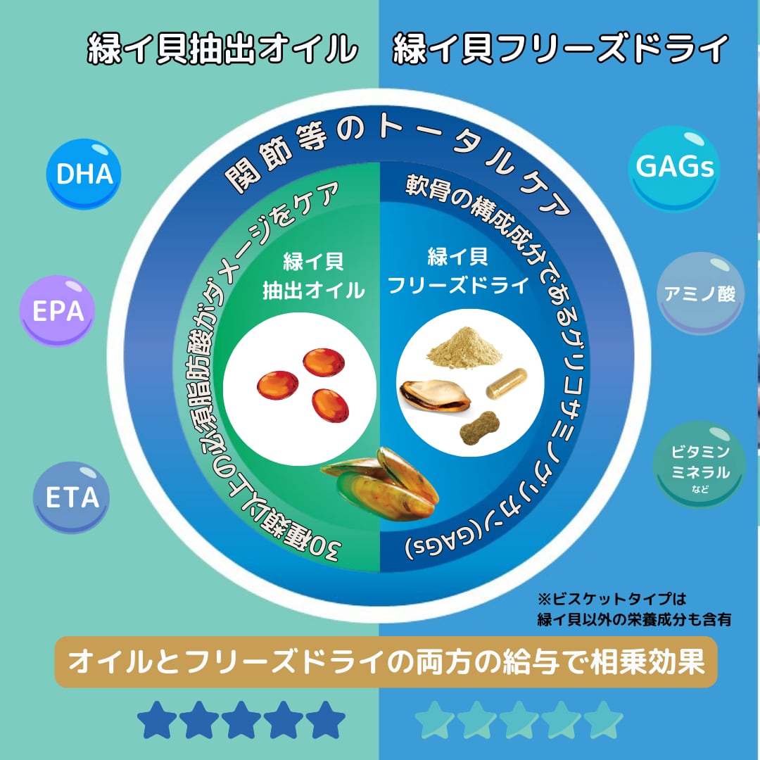 【緑イ貝フリーズドライパウダー】軟骨の構成成分であるグリコサミノグリカン/GAGs(ヒアルロン酸、コンドロイチン硫酸等)、関節や皮膚などの健康を維持するオメガ3脂肪酸(DHA、EPA)、アミノ酸、タウリン、ビタミン類ミネラル類など豊富な栄養素が含まれています。