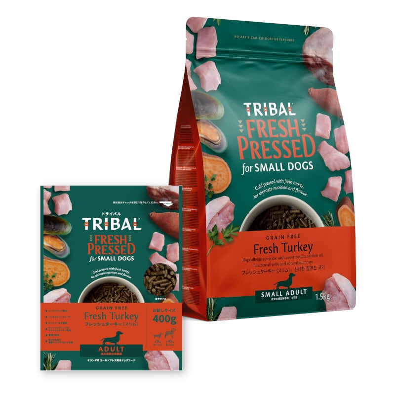 フレッシュターキーを使用したミートミール不使用のコールドプレス製法。低カロリーでヘルシー、鉄分豊富なフードです。