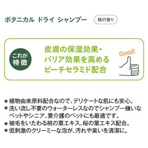 植物由来原料配合なので、デリケートな肌にも安心。 洗い流し不要のウォーターレスなのでシャンプー嫌いなペットやシニア、 要介護のペットにも最適です。 被毛をいたわる桃の葉エキス、桜の葉エキス配合。 低刺激のクリーミーな泡が、汚れや臭いを清潔に。