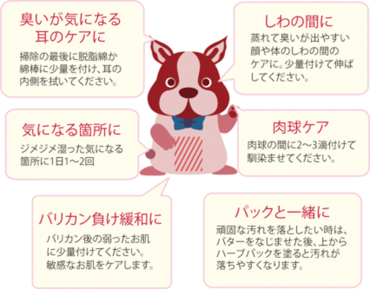 ・荒れて傷んだ肉球や湿った皮膚に、臭いが出やすい耳の掃除に、かぶれやすい顔や身体のしわの間、デキモノに。