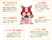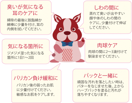 ・荒れて傷んだ肉球や湿った皮膚に、臭いが出やすい耳の掃除に、かぶれやすい顔や身体のしわの間、デキモノに。