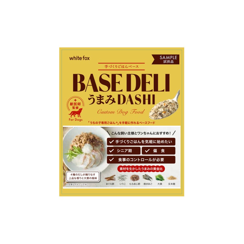 お湯を加えてお好きなお肉やお魚をトッピングするだけで、簡単に「うちの子専用ごはん」を作ることができる手作りベースフードです。BASE DELI うまみDASHIは、旨みの強い4種のお魚だし(まぐろ節、焼きあご、いりこ、むろあじ節)に、大葉を加えて香りにアクセントをつけました。また、お肉やお魚のたんぱく質の消化を助ける玄米麹を使用することで、より健康にも配慮した仕上がり。食べムラのあるパートナー(愛犬)や食事療法食を食べないパートナーにもおすすめです(リン値0.43%)。獣医師監修。国産。無添加・無着色・添加物不使用。