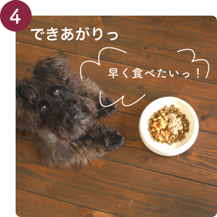 動物性たんぱく質1種類と野菜・くだもの、ハーブ、必須脂肪酸を含むオイル、カルシウム源をミックスした愛犬用ごちそうメニュー。