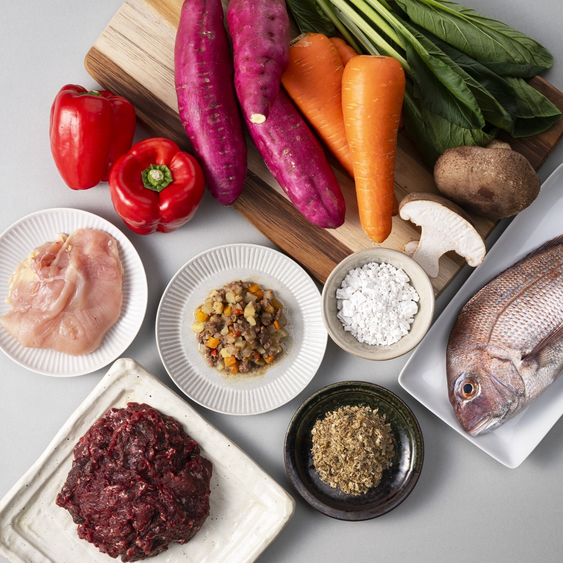 真鯛(国産)、さつまいも(徳島県産)、だいこん(国産)、にんじん(徳島県産)、小松菜(国産)、しいたけ(徳島県産)、カラーピーマン(国産)、葛粉(国産)、混合節だし(さば節・むろあじ節・いわし節)(国産)) (原材料の一部に さば を含む)