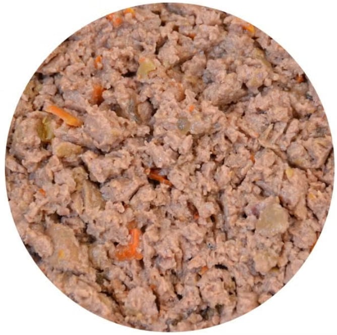 チキン 60%(精肉、肝臓、砂肝)、ブイヨン 25.8%、サツマイモ 5%、ニンジン 4%、洋ナシ 4%、ミネラル 1%、亜麻仁油 0.2%