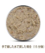 フィーラインナチュラルは基本的な与え方として、本来の食事に近づけるために、生食の水分値に戻してから与えていただくフードですので、粉状になっているものはそのまま、粒状のものはくずしてから、水かぬるま湯(37℃以下)を加えると短い時間で戻ります。
