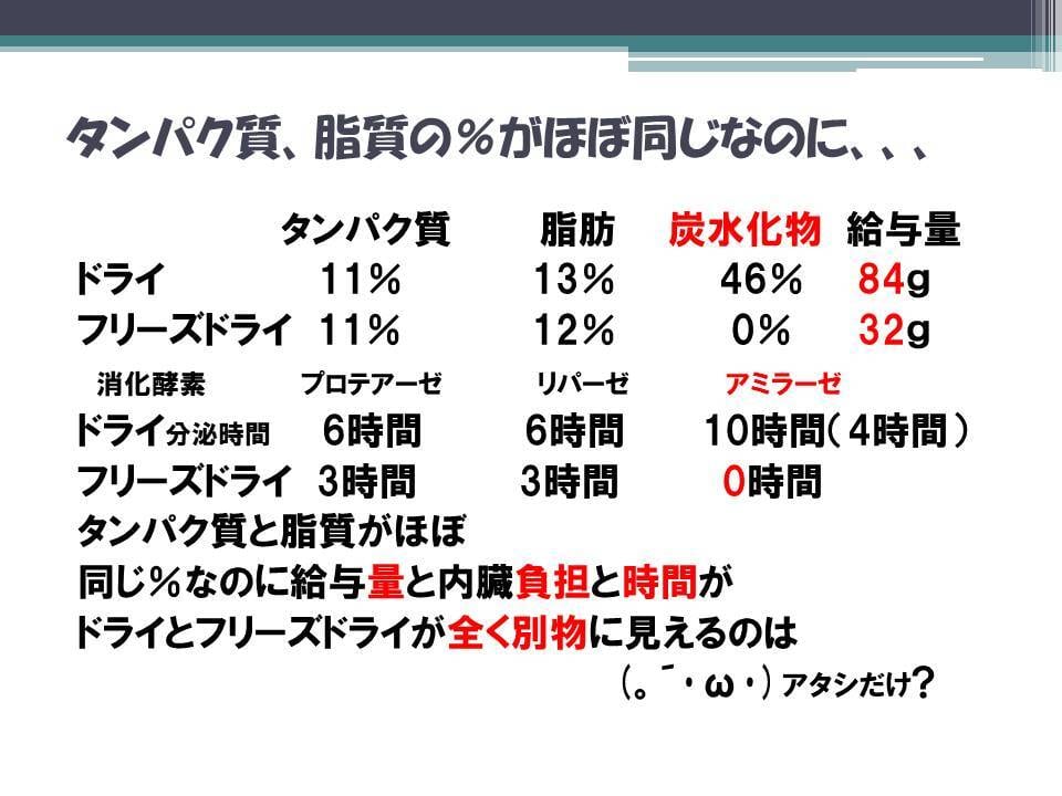 牛肉、水、レバー(牛)、グリーントライプ(牛)、腎臓(牛)、心臓(牛)、血(牛)、卵、脾臓(牛)、骨(牛)、ひまわり油、フラックスシードフレーク、昆布、ニュージーランド緑イ貝、かぼちゃ、ブロッコリー、カリフラワ-、キャベツ、リン酸ニカリウム、乾燥昆布、りんご、洋なし、塩化ナトリウム、ビタミンE、プロティネイト亜鉛、プロティネイト鉄、酸化マグネシウム、セレン酵母、プロティネイト銅、プロティネイトマンガン、ベータカロチン、ビタミンB1、ビタミンD3