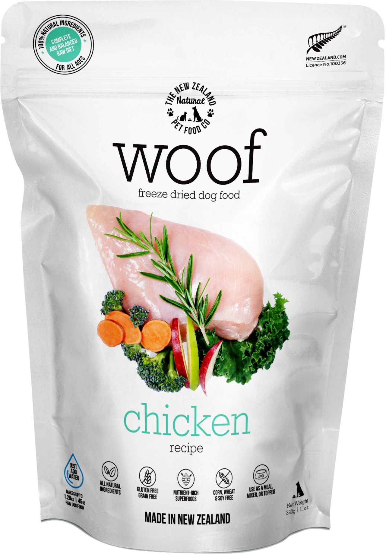 消化吸収性の高いチキンを主原料に、各種効果を期待できるマヌカハニー、チアシード、バージンココナッツオイル、ホキ肝油、緑イ貝、ケルプを配合しています。素材の「生」を大切に!安心のフリーズドライ製法で作っています。3倍量の水または37度以下のぬるま湯でふやかして与えるとおいしさ満点。フリーズドライドッグフードなので、お湯で戻すとまるで手作りフードように子犬からシニア期のワンちゃんまで与えやすい食事を作ることが出来ます。