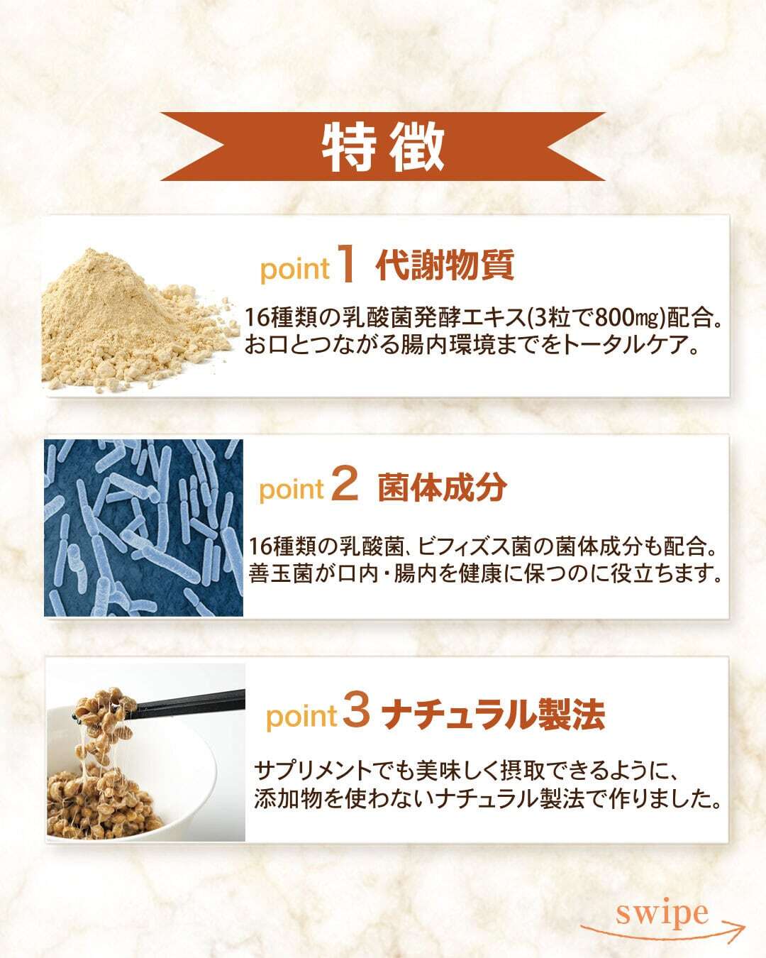 PREMEALは、16種類もの乳酸菌が作る物質(乳酸菌生産物質)を3粒で800㎎取れるようにしております。